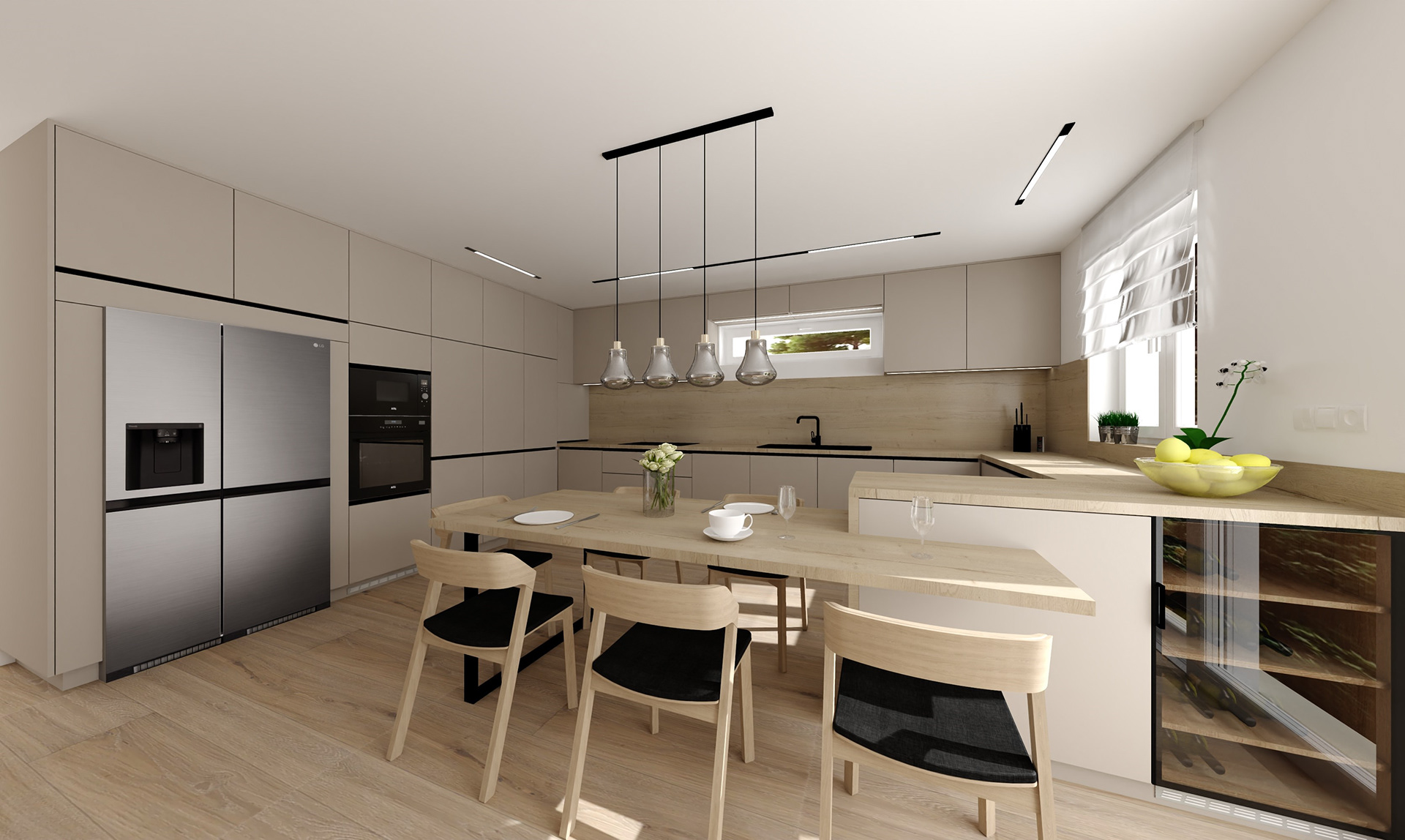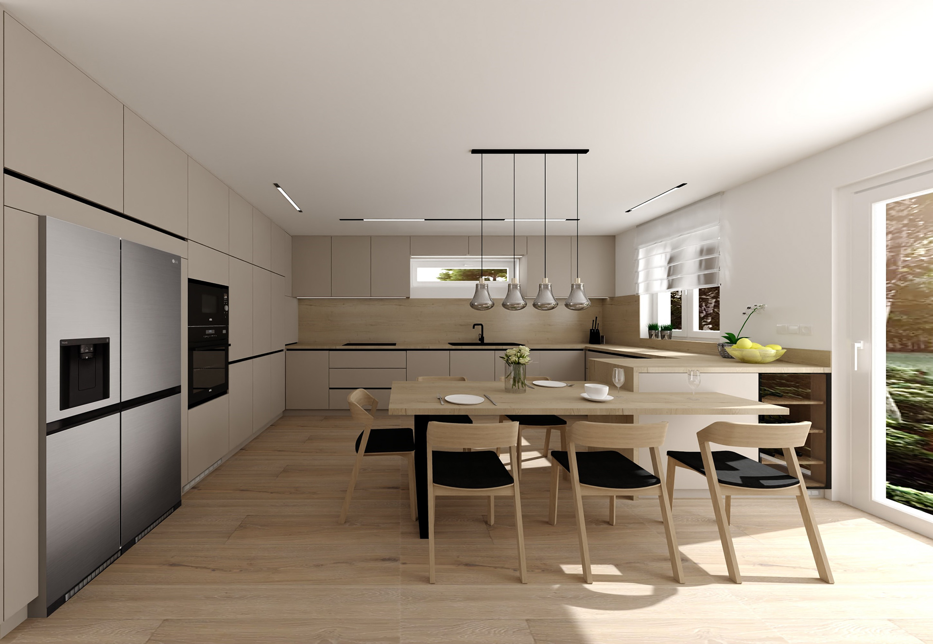 Návrh kuchyně s jídelnou v novostavbě rodinného domu.